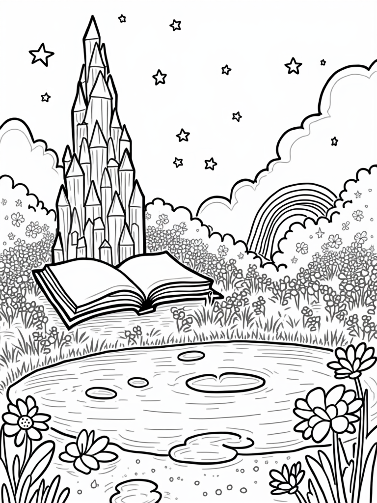 This enchanting scene is bursting with oversized flowers and twinkling stars that make it feel like a fairy tale! At the center, there's a grand, spiraling tower made of shimmering crystals, reaching high into the sky. Just nearby, a sparkling pond mirrors the tower, surrounded by heart-shaped lily pads. Butterflies flit about, adding to the magic, while a giant storybook lies open on a patch of soft grass.