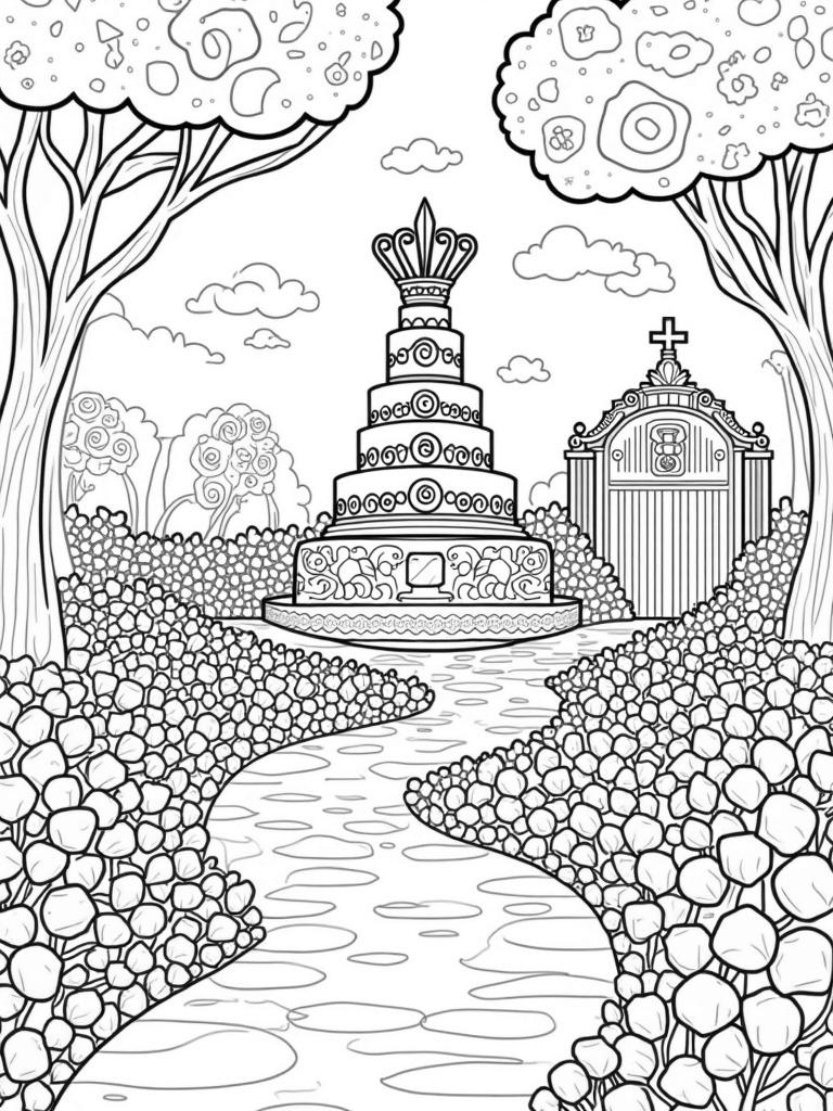 Check out this free, printable coloring page featuring a majestic cake surrounded by oversized flowers and whimsical trees. Perfect for little princesses and princes who love to color!