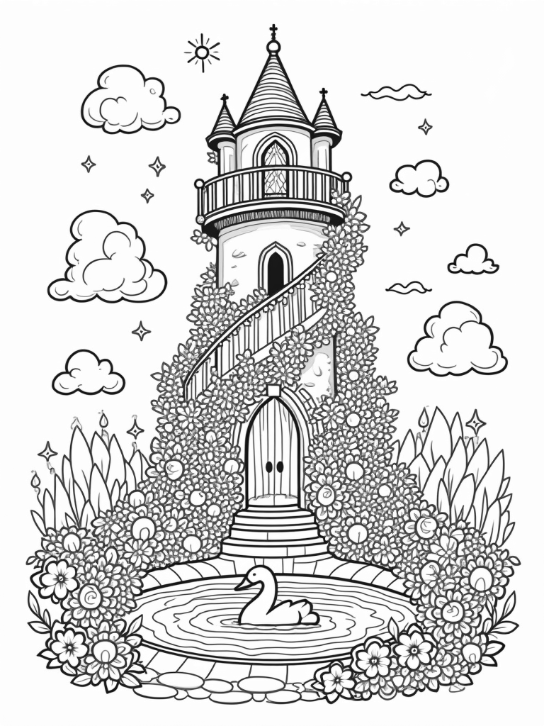 Majestic Castle Tower with Spiral Garden and Swan Fountain Coloring Page