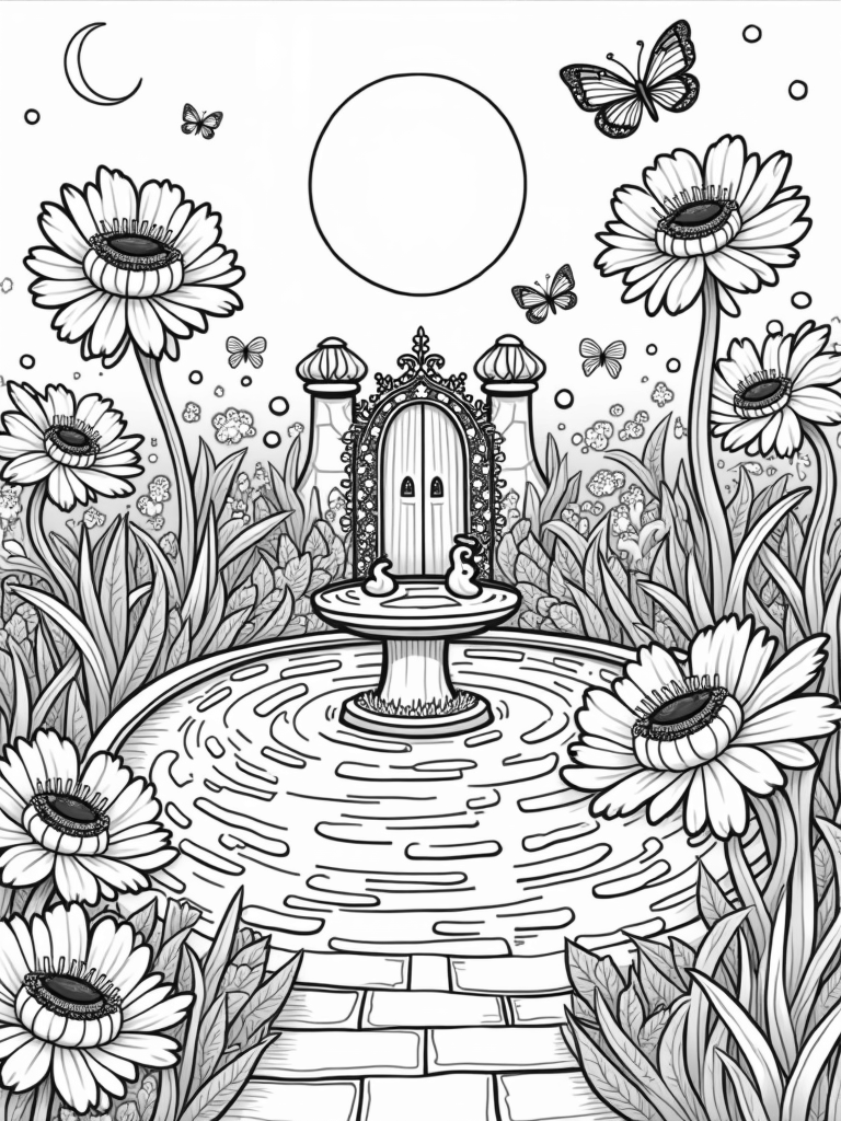 As you color, don’t forget about the delicate butterflies fluttering above! Their lace-like wings seem to dance among the flowers, bringing even more life to the scene. And look up! A crescent moon hangs in the sky, casting a soft glow that makes everything feel even more enchanting. It’s a perfect setting for some imaginative coloring!
