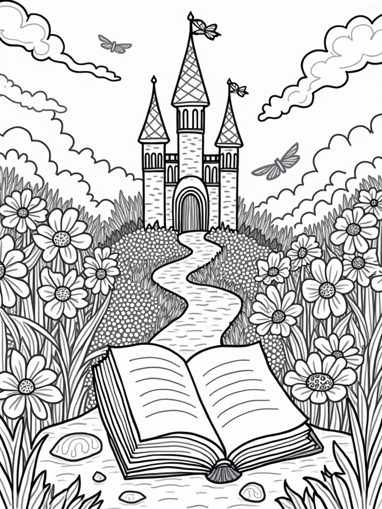 As you color, don't forget about the colorful butterflies fluttering around and the sparkling fountain that bubbles with rainbow water. There's even a winding path made of candy stones leading to a giant storybook lying on a grassy hill, just waiting for your imagination to leap into its pages.
