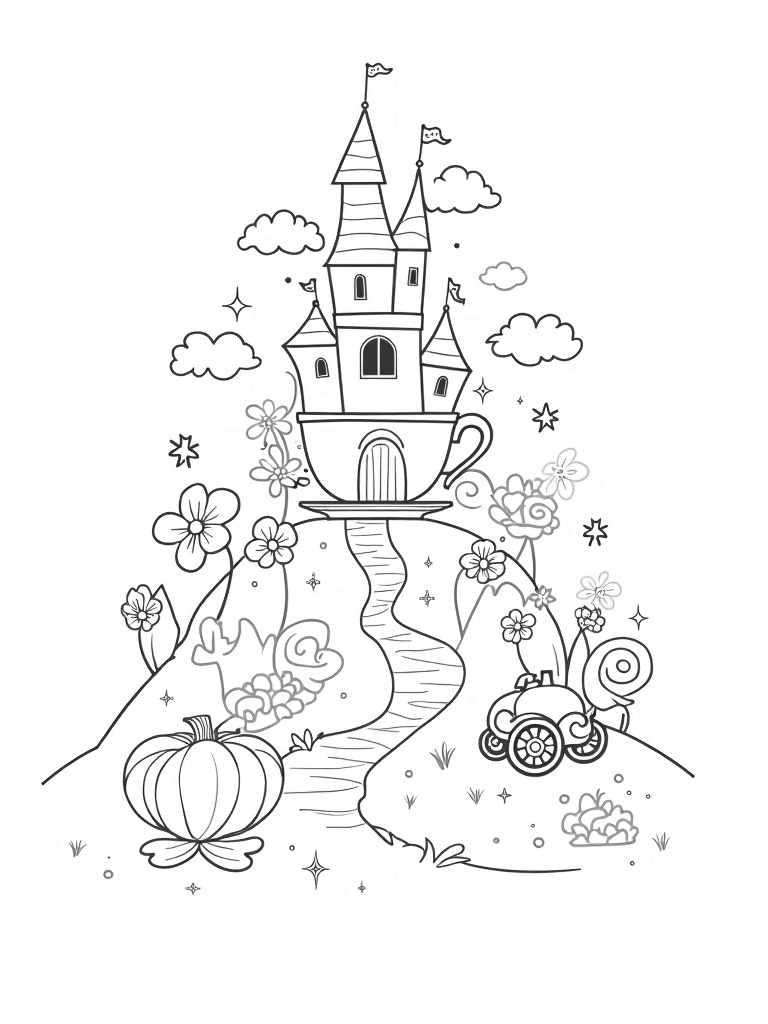 Check out this free, printable coloring page featuring a teacup castle surrounded by candy-colored hills and a pumpkin carriage. Perfect for kids who love princesses and magical worlds!