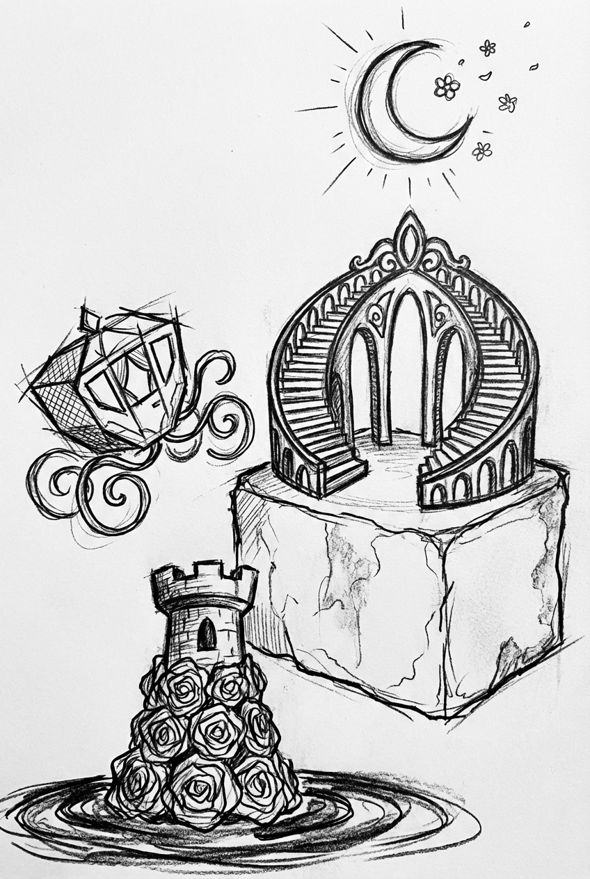 A giant silver tiara sits atop a smooth marble pedestal, its arches turning into spiraled staircases that seem to reach the clouds. Next to it, a crystal carriage made of shattered stained‑glass mirrors drifts, its wheels swapped for swirling ribbons that curl like vines. In the background, a tall castle turret built from interlocking enamel roses rises out of a deep sapphire pool, windows flickering with candlelight. Above everything, a moon‑shaped lantern glows softly, spilling gentle light onto floating satin blossoms.