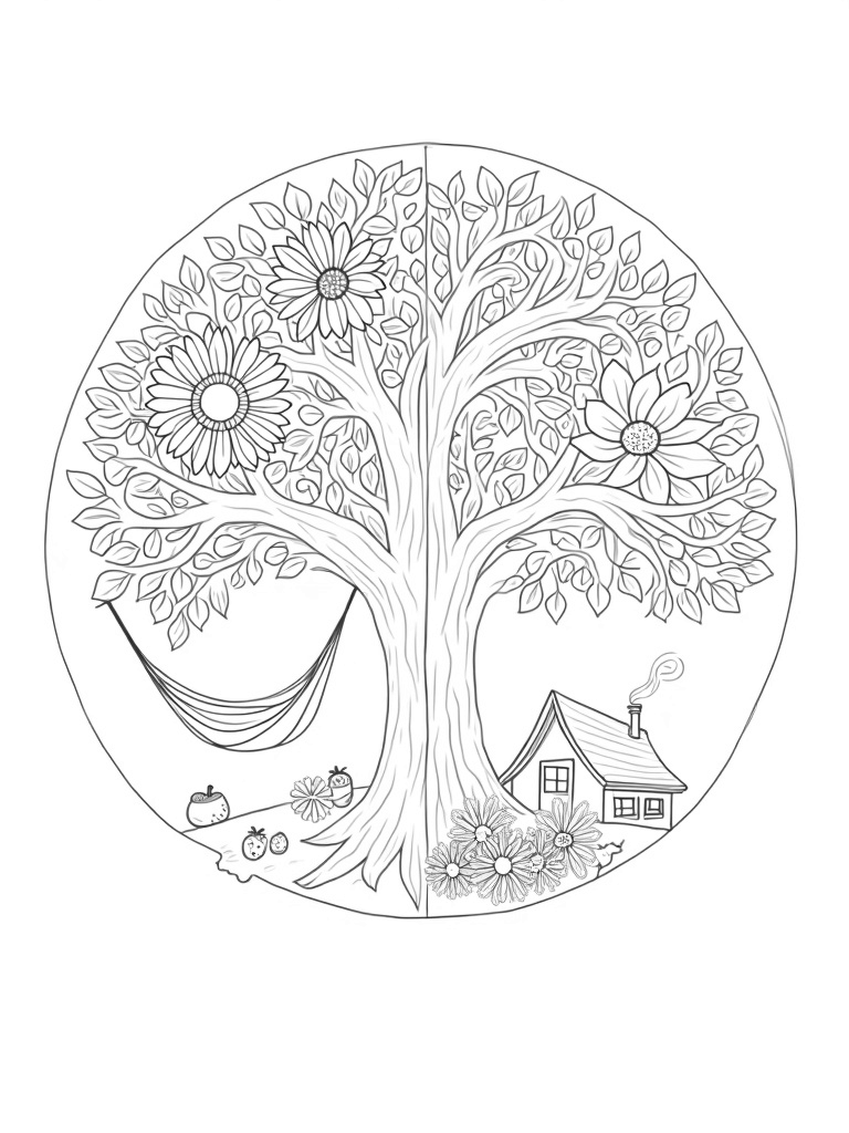 Check out this awesome circular tree that shows all four seasons in one go! The top left corner is bursting with the lively colors of spring, complete with blossoms and dancing butterflies. Swing over to the top right, where summer shines bright with sunflowers and a cozy hammock waiting for someone to take a nap.