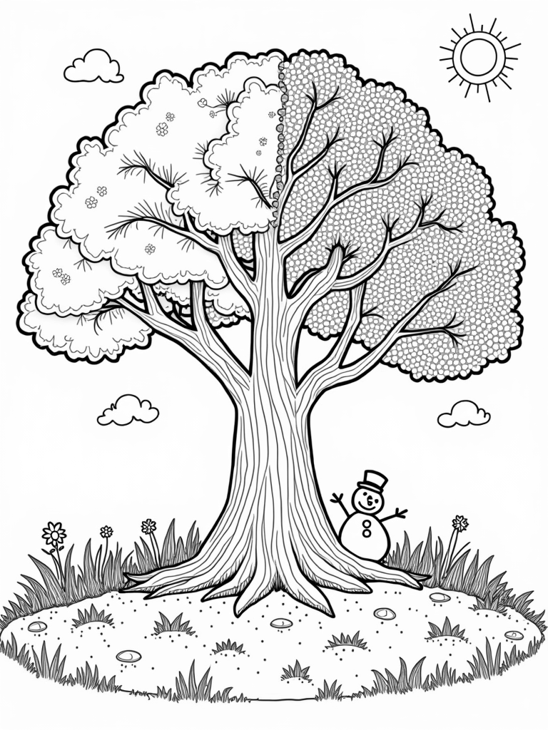 This coloring page showcases a giant tree standing proudly in the middle of a circular meadow, with its trunk beautifully divided into four sections, each representing a different season. To the left, spring bursts with oversized flowers and swirling vines, while snowdrops and daffodils peek out in the foreground. On the right, summer comes alive with cheerful sunflowers and playful butterflies, all under a bright, shining sun.