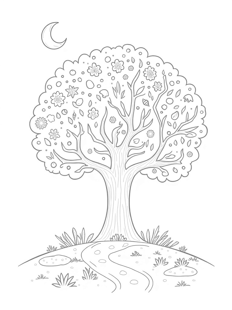 This coloring page shows a whimsical tree with four unique branches, each celebrating a different season. The left branch is bursting with vibrant spring blossoms and playful butterflies, making it feel alive and fresh. On the right, you’ll find summer fruits and bright sunbursts, perfect for those sunny days. The bottom branch captures autumn's beauty with swirling leaves and acorns, while the top branch is a serene winter scene featuring intricate snowflakes and a crescent moon hanging above.