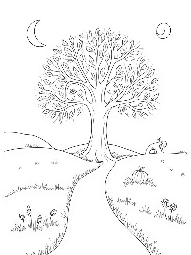 Check out this delightful tree with four branches, each representing a different season! Spring is bursting with beautiful blossoms, while summer has those big, cheerful leaves. When you look at autumn, you'll see leaves swirling down, and winter is topped with pretty snowflakes. Below the tree, there's a charming path that winds through grassy hills, dotted with seasonal flowers, pumpkins, and even a snowman. Can you spot them all?
