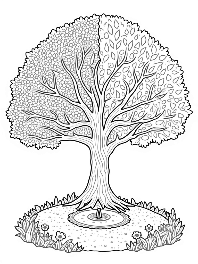 This coloring page showcases a magnificent tree that changes with the seasons! On one side, spring bursts with beautiful blossoms and fluttering butterflies, while summer is alive with lush green leaves and cheerful sunflowers. As you shift around to autumn, you'll see swirling leaves in stunning shades of orange and gold. Finally, winter brings a serene scene of bare branches draped with delicate snowflakes and icicles.