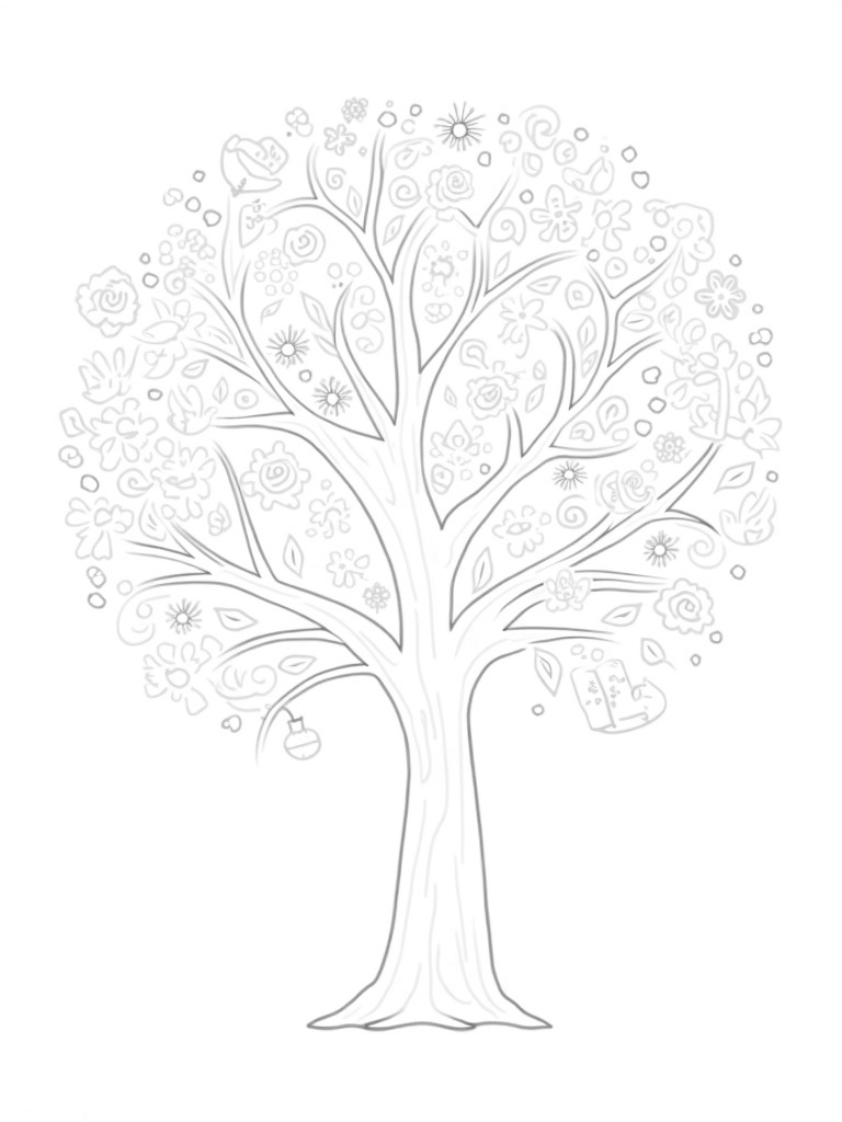 Four Seasons Tree with Blossoms, Leaves, Pumpkins, and Snowflakes Coloring Page