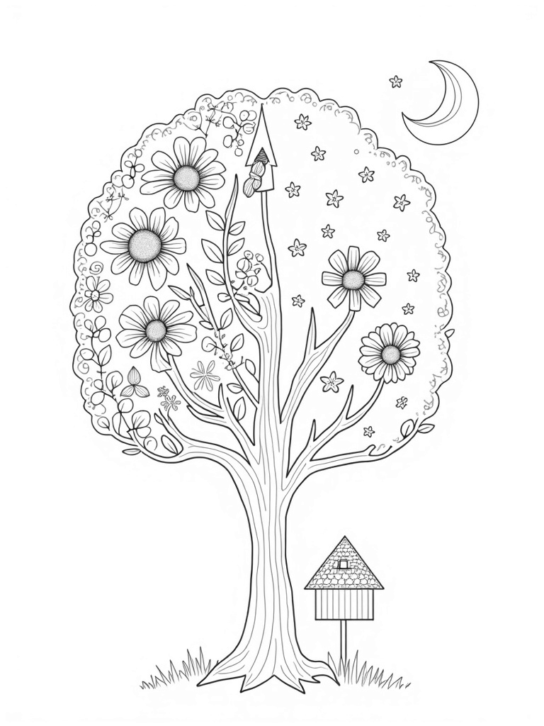 This coloring page showcases a delightful tree divided into four sections, each representing a different season. On the left, spring bursts forth with lovely flowers and playful butterflies, inviting you to bring it to life with your favorite colors. Move to summer, where bright sunflowers stretch up to a shining sun, radiating warmth and cheer.