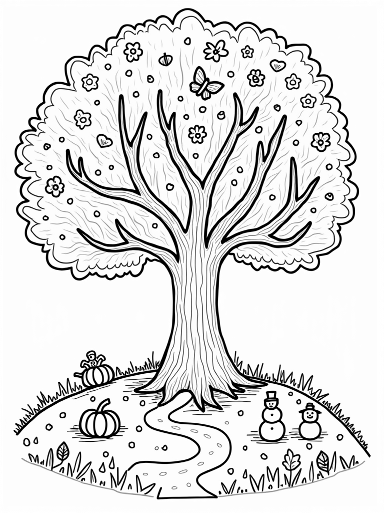 Below this magnificent tree, a winding path meanders through a delightful mix of seasonal symbols. You can spot a bright sun and playful raindrops for spring, a cheerful pumpkin for autumn, and even some friendly snowmen for winter. It’s like a little celebration of nature’s changes, waiting for your colorful touch!