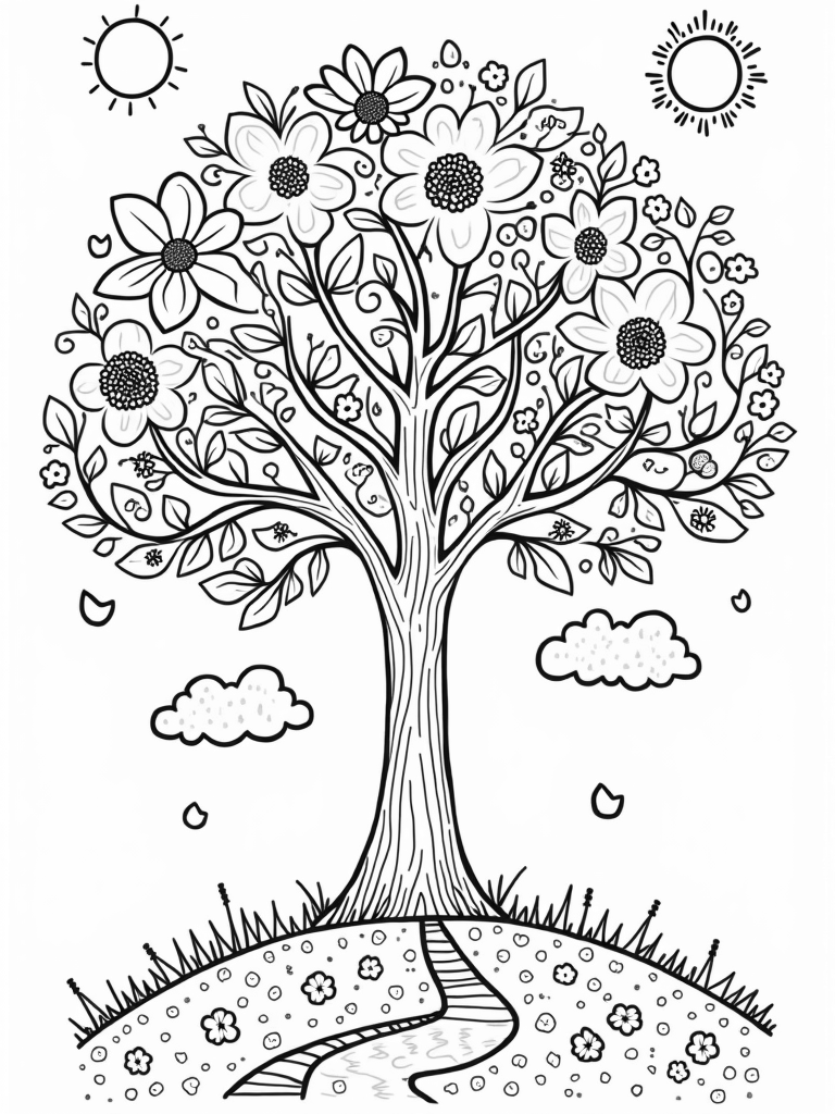 Underneath this magical tree, a winding path is adorned with patterns that celebrate each season. A shining sun and a gentle moon hang in the sky, casting soft rays over this vibrant scene. Kids will love coloring the various elements, from the blossoms of spring to the frosty details of winter!