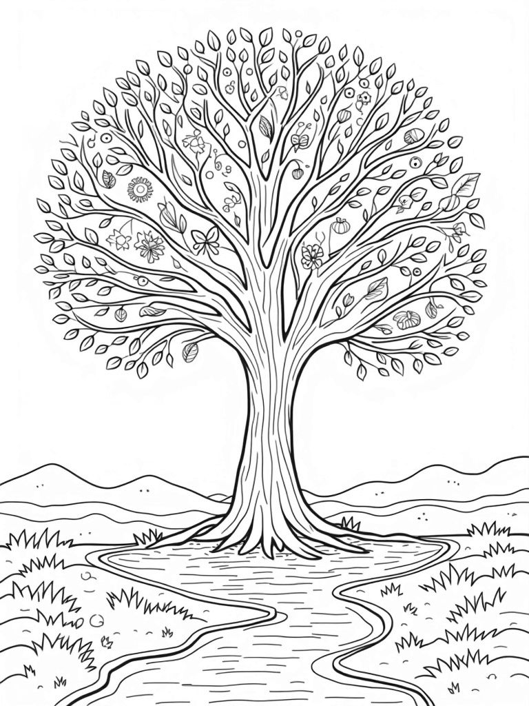 Four Seasons Tree with River Coloring Page