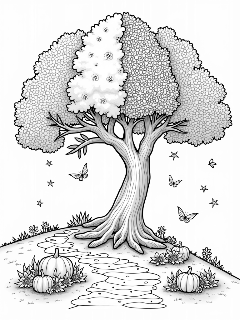 Four Seasons Tree with Scenic Path Coloring Page