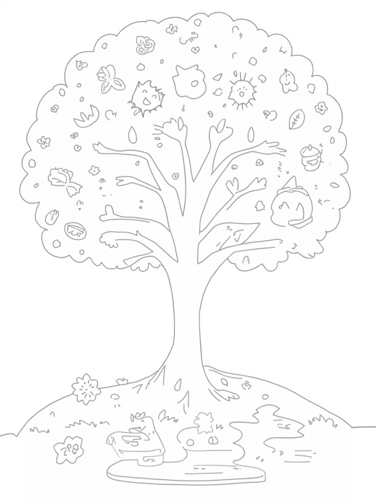 Underneath this magical tree, there's a winding path that leads to all sorts of seasonal delights. You’ll find a picnic blanket laid out with yummy seasonal treats, making it perfect for a family outing. Nearby, a small pond reflects the sky, adding a serene touch. Plus, check out the abstract patterns that represent the weather throughout the year, like gentle breezes and raindrops. It's a delightful scene to color and enjoy!
