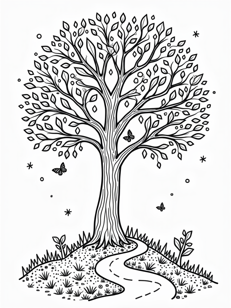 Underneath this enchanting tree, a winding path invites you to explore the beauty of each season. You'll find cheerful flowers, bright suns, crunchy fallen leaves, and even cute snowmen! It's like a little tour through the year, waiting for you to add your own splash of color.
