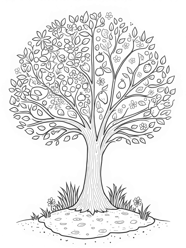 This coloring page showcases a whimsical tree divided into four sections, each representing a different season. In spring, oversized flowers bloom alongside cheerful butterflies. Summer brings large, sun-shaped fruits and leafy sunbathers enjoying the warm rays. As autumn rolls in, swirling leaves create a cozy blanket around the trunk, while winter wraps everything in a soft layer of snowflakes and dangling icicles.