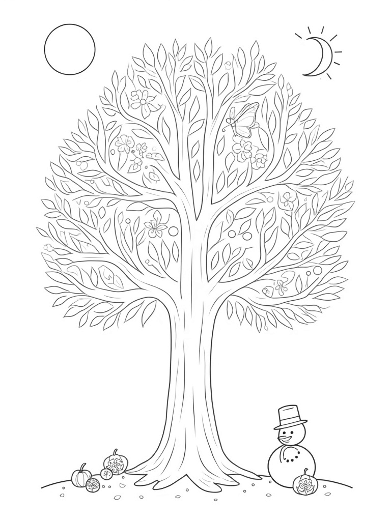 Four Seasons Tree with Seasonal Symbols Coloring Page