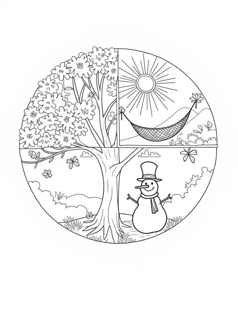 Four Seasons Tree with Spring Flowers, Summer Sun, Autumn Leaves, and Winter Snowman Coloring Page