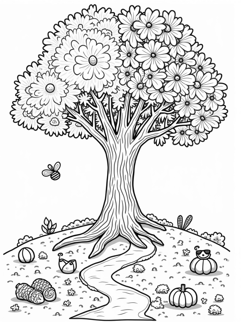 This giant tree is a beautiful representation of all four seasons! On the left, spring bursts with oversized flowers and busy bees buzzing around. Each flower is just waiting for your favorite colors to bring them to life! As you move to the right, autumn takes over with its vibrant leaves and acorns, ready to fall from the branches. Can you imagine the crunch of those leaves under your feet?