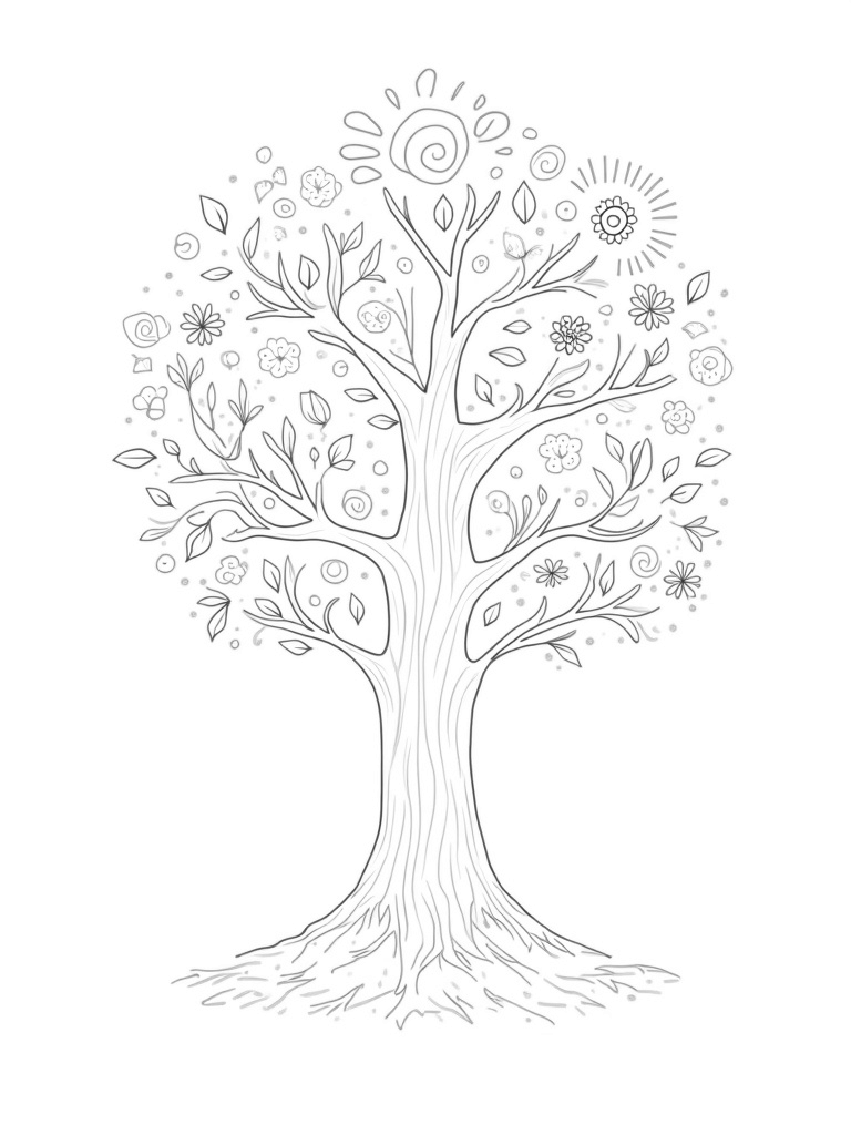 This coloring page showcases a delightful tree with four unique branches, each representing a different season. On the left, spring comes alive with oversized flowers and swirling vines, perfect for adding splashes of color. In the center, summer shines with bright suns and playful waves, inviting you to bring out your favorite summer shades. Over to the right, autumn is all about the falling leaves and acorns, giving you a chance to play with warm, earthy hues. Lastly, winter brings a magical touch with intricate snowflakes and a beautiful ice sculpture.