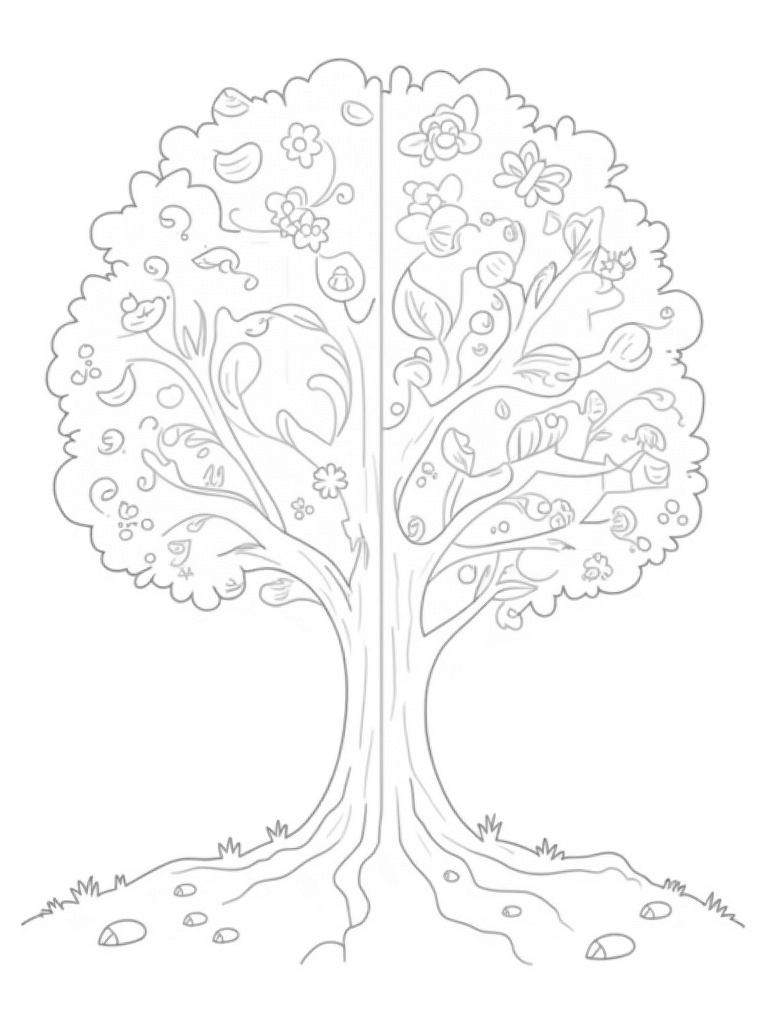 This coloring page showcases a delightful tree that splits into four distinct sections, each bursting with the spirit of a different season. On the left, you'll find spring's oversized flowers and cheerful butterflies dancing around. Move to the center, and you can imagine lounging under the lush summer canopy, where playful sunbathers relax on giant leaves. To the right, autumn takes the stage with branches adorned in swirling leaves of all shapes and sizes, some gently floating down to the ground. Finally, winter brings a sparkling snow-capped top, complete with shimmering ice crystals and geometric snowflakes drifting down like tiny winter gifts.