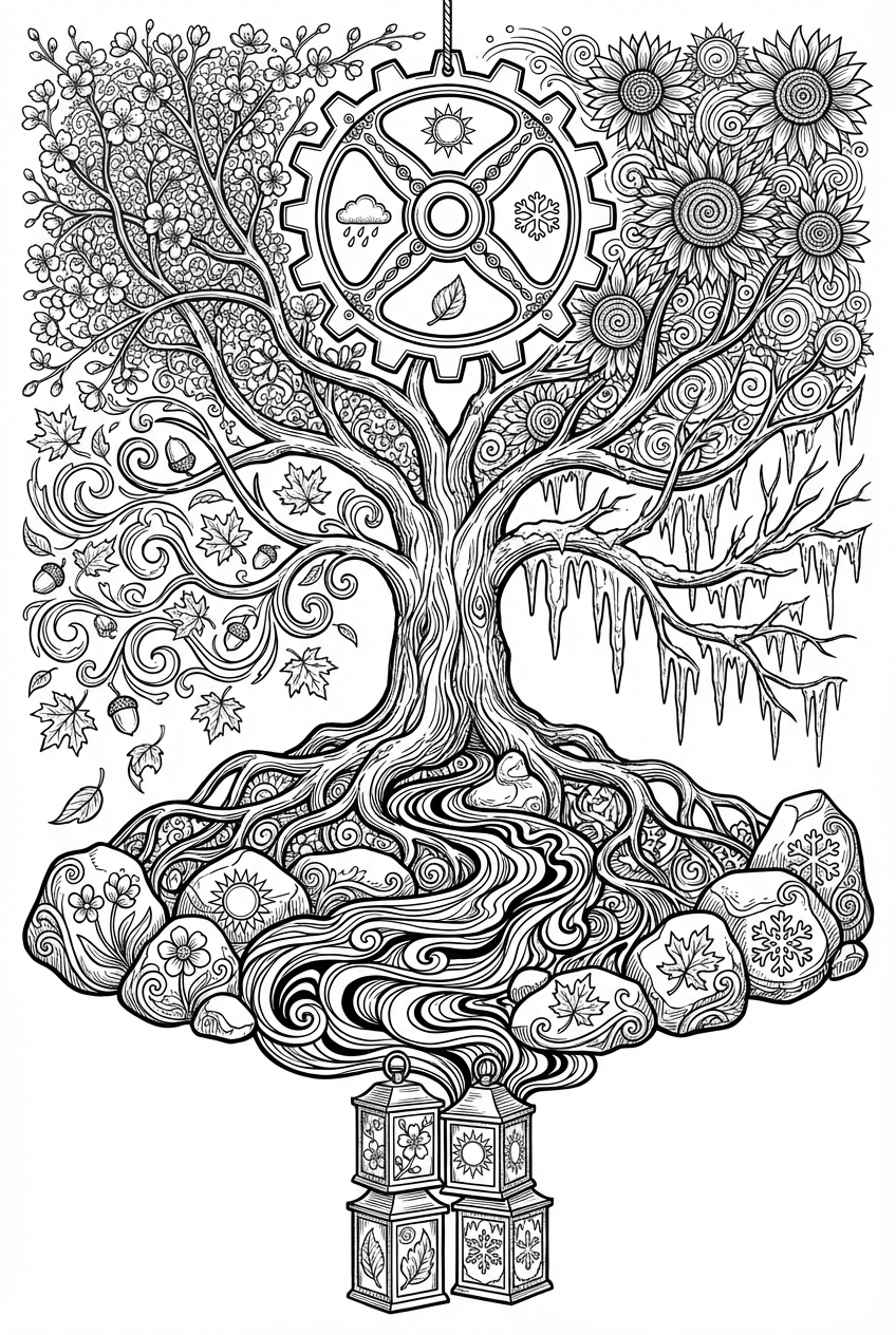 Right in the middle of the page you’ll see a huge old‑fashioned tree split into four neat quadrants, each one showing a different season. The top‑left corner bursts with cherry blossoms for spring, the top‑right glows with sunny sunflowers for summer, the bottom‑left swirls with maple leaves for autumn, and the bottom‑right hangs icy icicles for winter. Hovering above the branches is a little gear with a sun, cloud, leaf and snowflake turning together, and a winding ink‑river snakes through the roots, lined with stones that match each season. At the base, four tiny lanterns stack up, each shaped like its own season’s vibe.