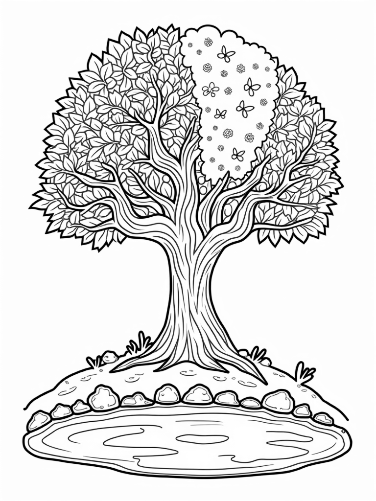 Seasonal Tree with a Tranquil Pond Coloring Page