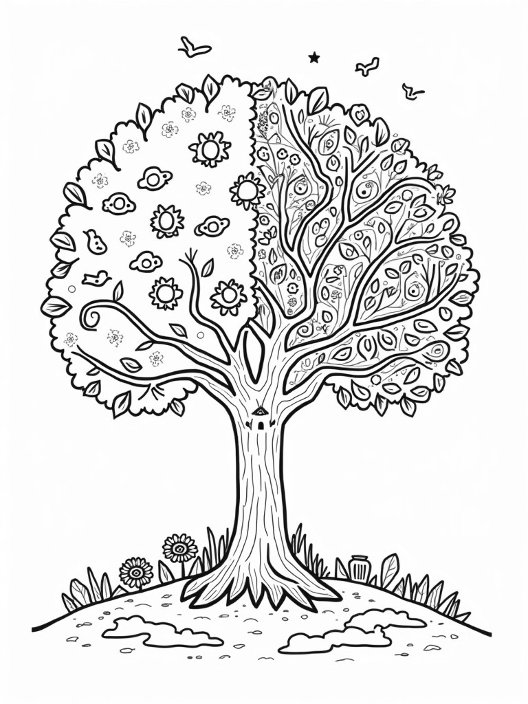 This coloring page showcases a magical tree that changes with the seasons! On one side, the branches are bursting with colorful spring blossoms and cheerful birds, making it feel alive with the joy of warmer days. Then, as you move around, you’ll find summer’s section filled with fun sun-shaped fruits and fluffy clouds floating lazily above. Autumn brings a flurry of swirling leaves in bright hues, making it a perfect spot for a cozy fall scene. Lastly, at the bottom, winter’s icy crystals create delicate patterns around a frosted lantern, lighting up the chilly atmosphere.