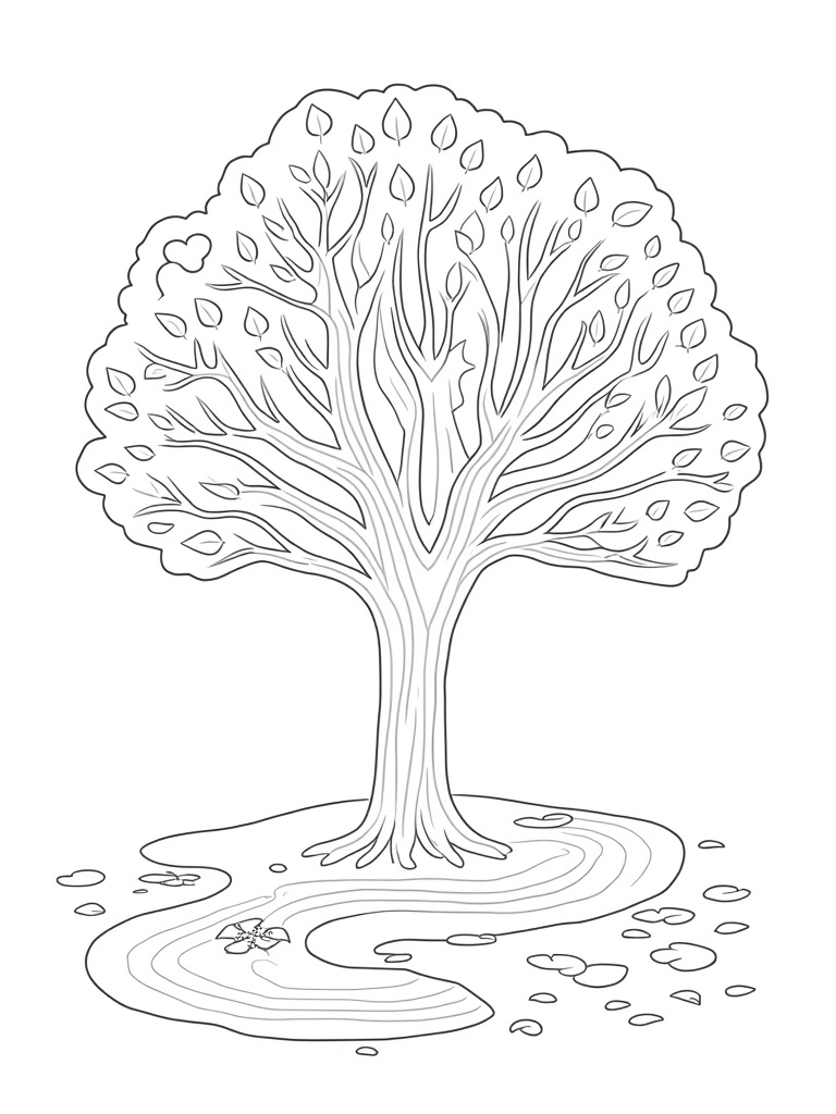 This free, printable coloring page features a vibrant tree representing all four seasons, with a swirling river and a mix of sun and moon in the sky. Perfect for kids to explore their creativity while learning about seasons!