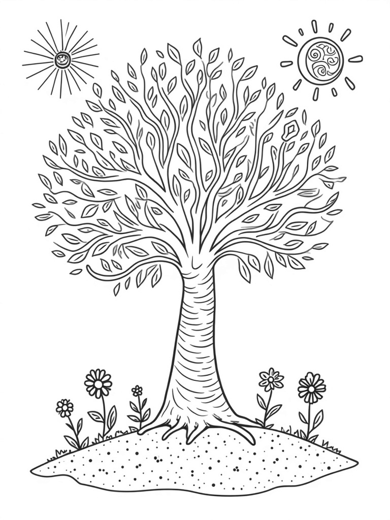 Seasonal Tree with Spiraling Trunk and Flowers Coloring Page