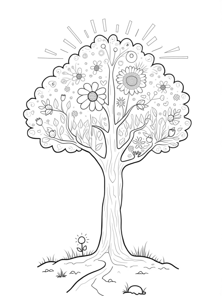 This coloring page shows a fantastic tree split into four sections, each capturing the magic of a different season. On the left, spring bursts forth with bright blossoms and fluttering butterflies, while the right side transitions into autumn, with golden leaves and acorns scattered on the ground. In the summer section, oversized sunflowers reach for the sun, casting cheerful rays that playfully mingle with the winter section, where snowflakes and icicles dangle from bare branches.