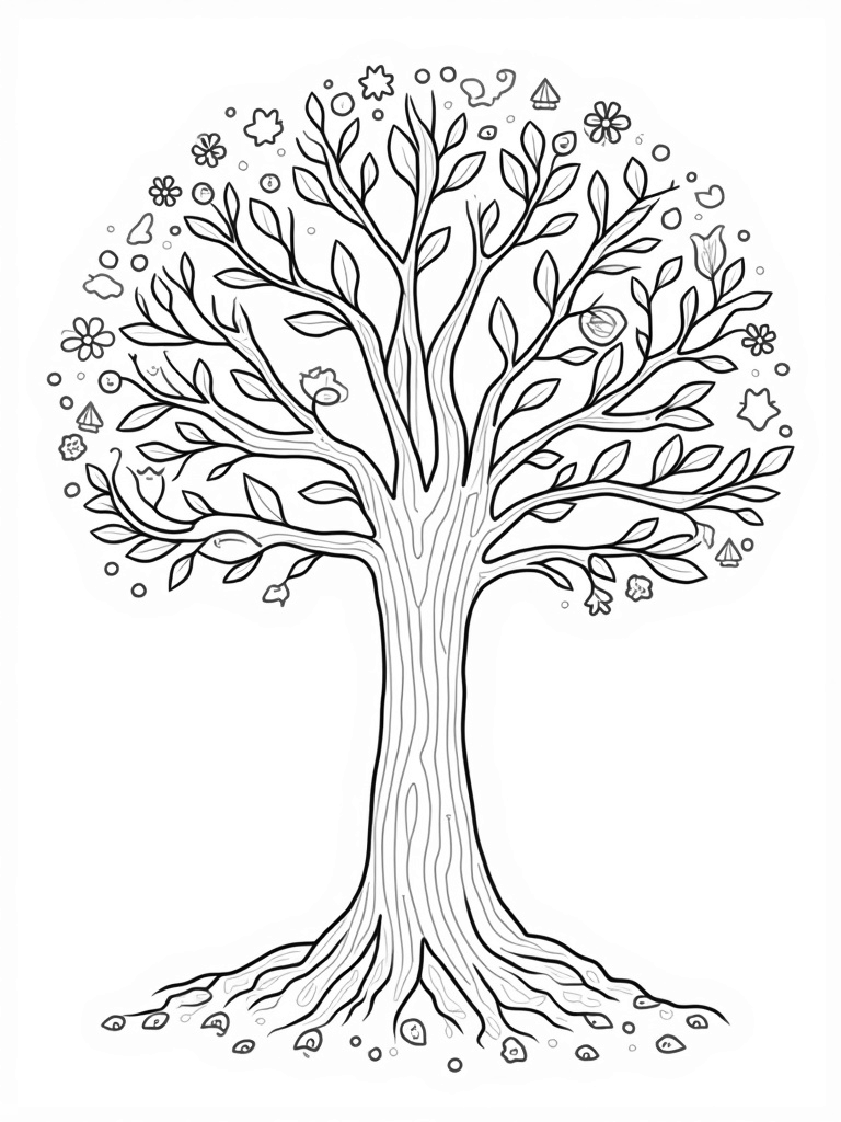 This coloring page showcases a whimsical tree, its branches stretching out in four directions, each representing a different season. On the left, you'll find bright green leaves and beautiful flowers that celebrate the freshness of spring. To the right, golden acorns and swirling winds capture the essence of autumn, reminding us of cozy sweater weather. Below, the roots are surrounded by a frosty winter scene, complete with delicate snowflakes that add a magical touch. And on the opposite side, summer bursts forth with shining sun beams and scattered seashells, inviting you to feel the warmth of sunny days.