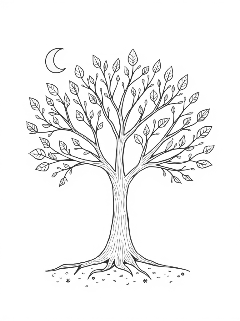 As you color this enchanting scene, don’t forget the crescent moon peeking through the branches! Its soft glow adds a peaceful vibe to the whole picture. Imagine how fun it would be to fill this tree with your favorite colors for each season. Whether you want to bring the spring blossoms to life or highlight the golden autumn leaves, the choice is all yours!