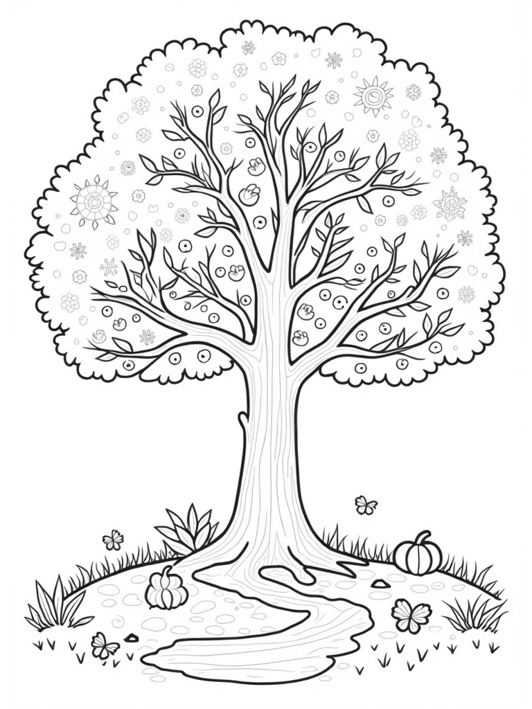 Underneath the tree, there's a charming circular stone path that winds through patches of grass, each representing the four seasons. You can find little seasonal treasures scattered about, like cheerful snowmen, playful pumpkins, and fluttering butterflies. It’s a delightful mix that invites kids to bring each part of the year to life with their favorite colors!