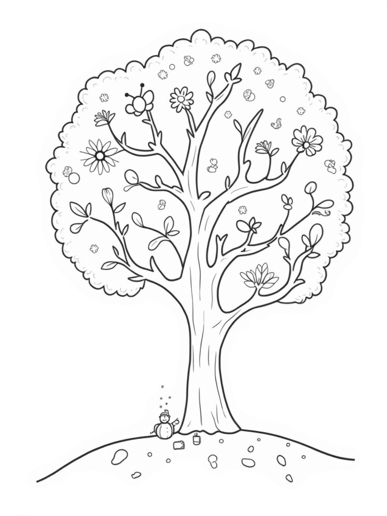 Seasons Tree with Spring Flowers, Summer Fruits, Autumn Leaves, and Winter Snowman Coloring Page