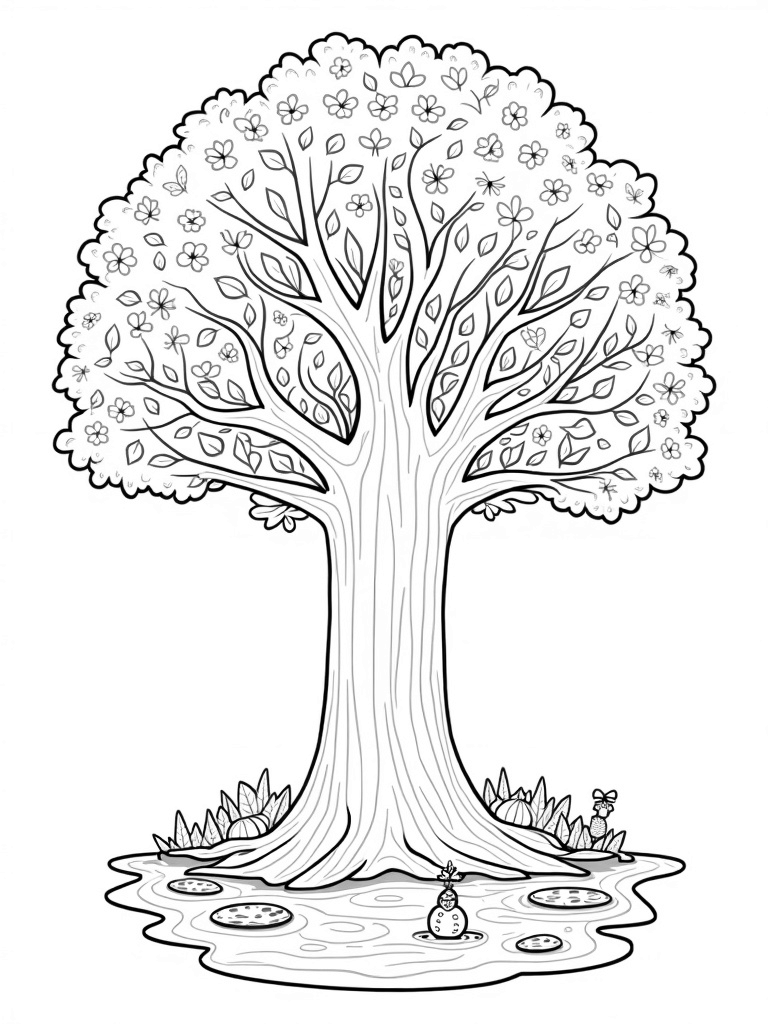 Underneath this grand tree, a circular pond reflects the bright summer sun, dotted with floating lily pads and playful dragonflies zipping about. On the opposite side, winter blankets the ground with delicate snowflakes and a stunning ice sculpture, adding a magical touch. Scattered around the base, you'll find a cheerful snowman, a basket brimming with ripe fruits, and a pile of leaves ready for jumping.
