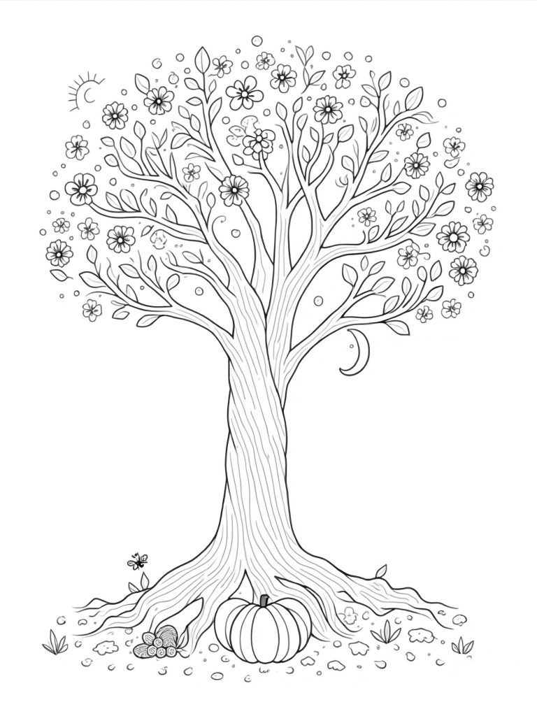 At the heart of this coloring page is a grand tree with a wonderfully twisted trunk. Its branches stretch out in every direction, beautifully showcasing the four seasons. On the left, spring bursts to life with vibrant blossoms and cheerful bees buzzing around. Over on the right, summer shines bright with bold sunflowers and a radiant sun that makes everything feel warm and lively.