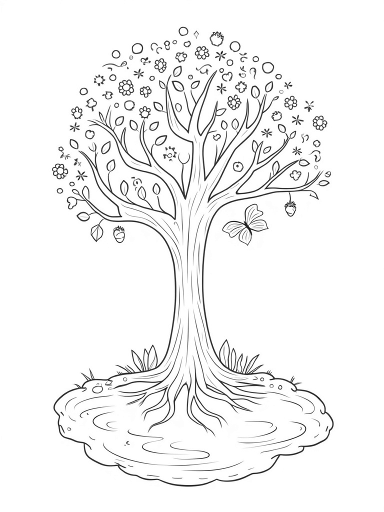This coloring page showcases a magical tree with four branches, each representing a different season. Spring bursts with colorful flowers and butterflies, while summer hangs juicy fruits low on the branches. Autumn brings a shower of vibrant leaves, and winter covers the tree in delicate snowflakes and icicles. Below the tree, a winding path made of seasonal stones leads to a serene pond, reflecting the beauty of each season above.