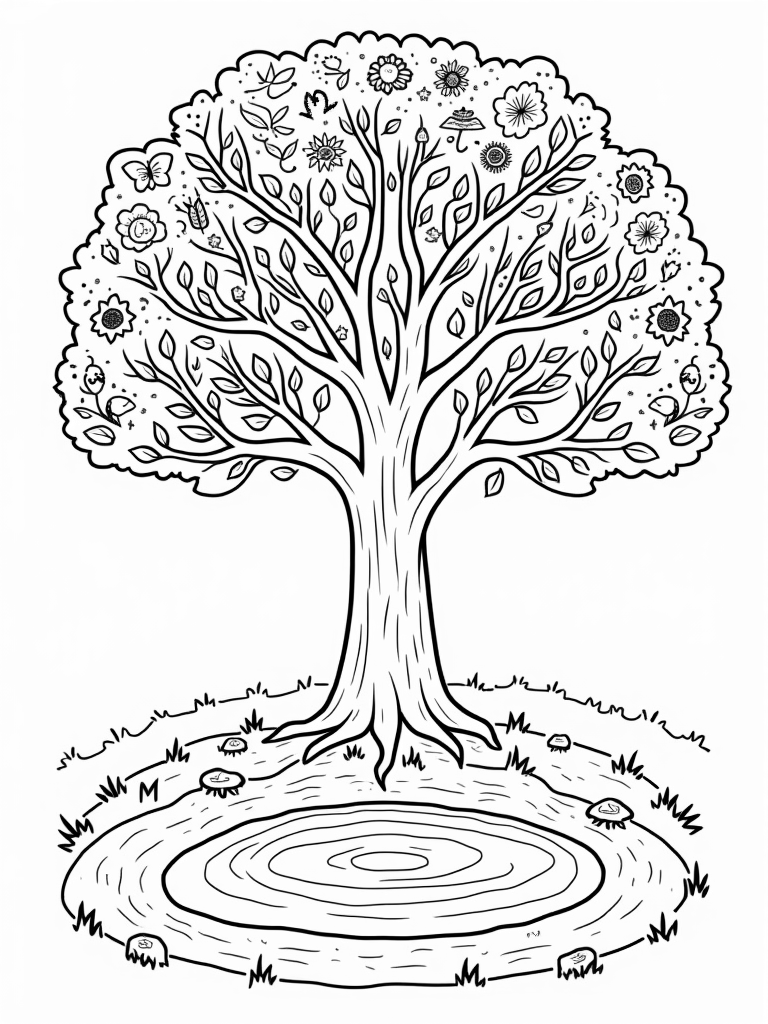 Beneath the tree, a winding path meanders towards a circular pond that reflects the seasonal beauty above. Small stones lining the path have seasonal motifs engraved on them, making each one a little treasure to color. This design is not just fun but also a great way to learn about all four seasons while you color!