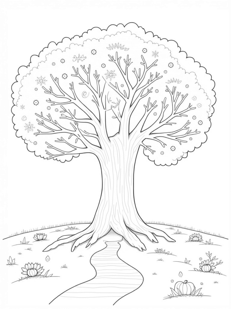 Surrounding the tree, four unique pathways lead you through a seasonal wonderland. Each path is lined with symbols like icicles for winter, cheerful daisies for spring, bright sunflowers for summer, and crunchy acorns for autumn. It's a delightful way to bring the seasons to life!