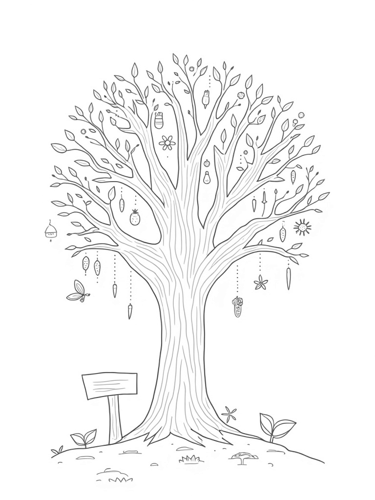Each quadrant of the tree has its own unique charm, inviting you to use your favorite colors. You can choose vibrant shades for summer fruits or soft pastels for the spring flowers. Don’t forget the winding path that leads through this seasonal wonderland, complete with a cute little signpost pointing to each season!