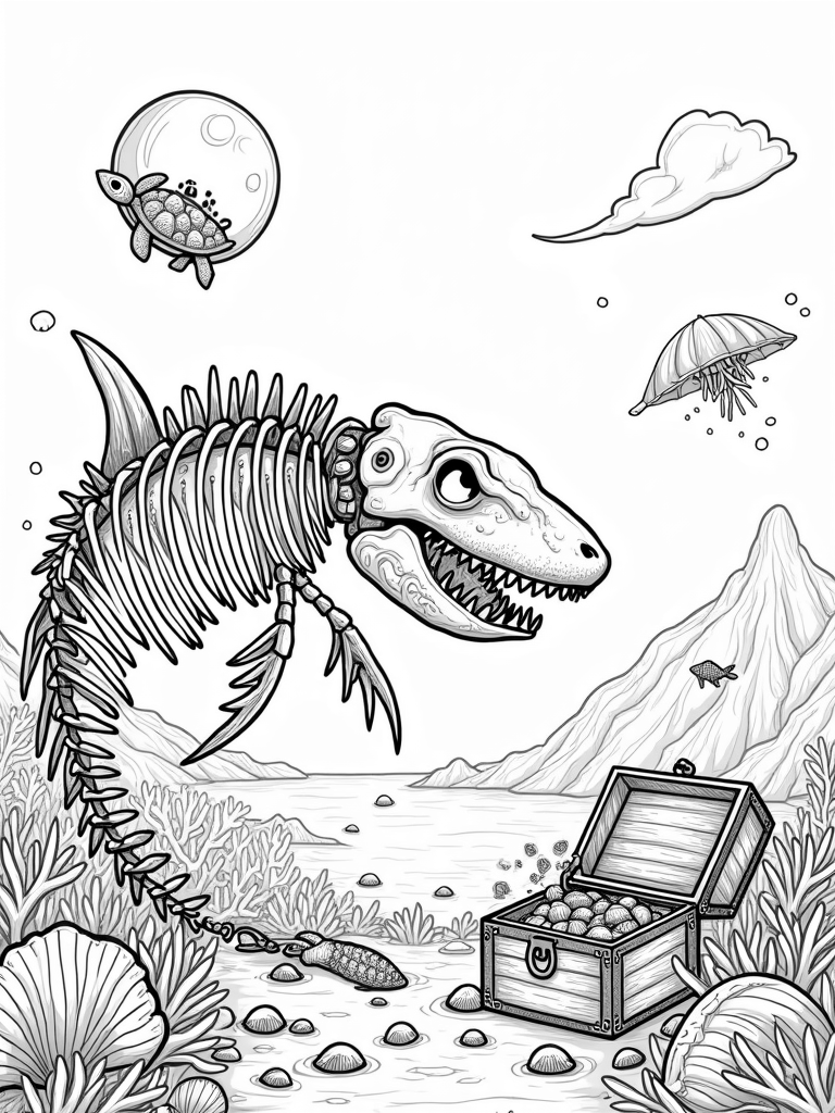 Check out this free, printable coloring page featuring an ancient shark skeleton surrounded by colorful coral reefs. Perfect for kids who love ocean life and want to add their own creative touch!