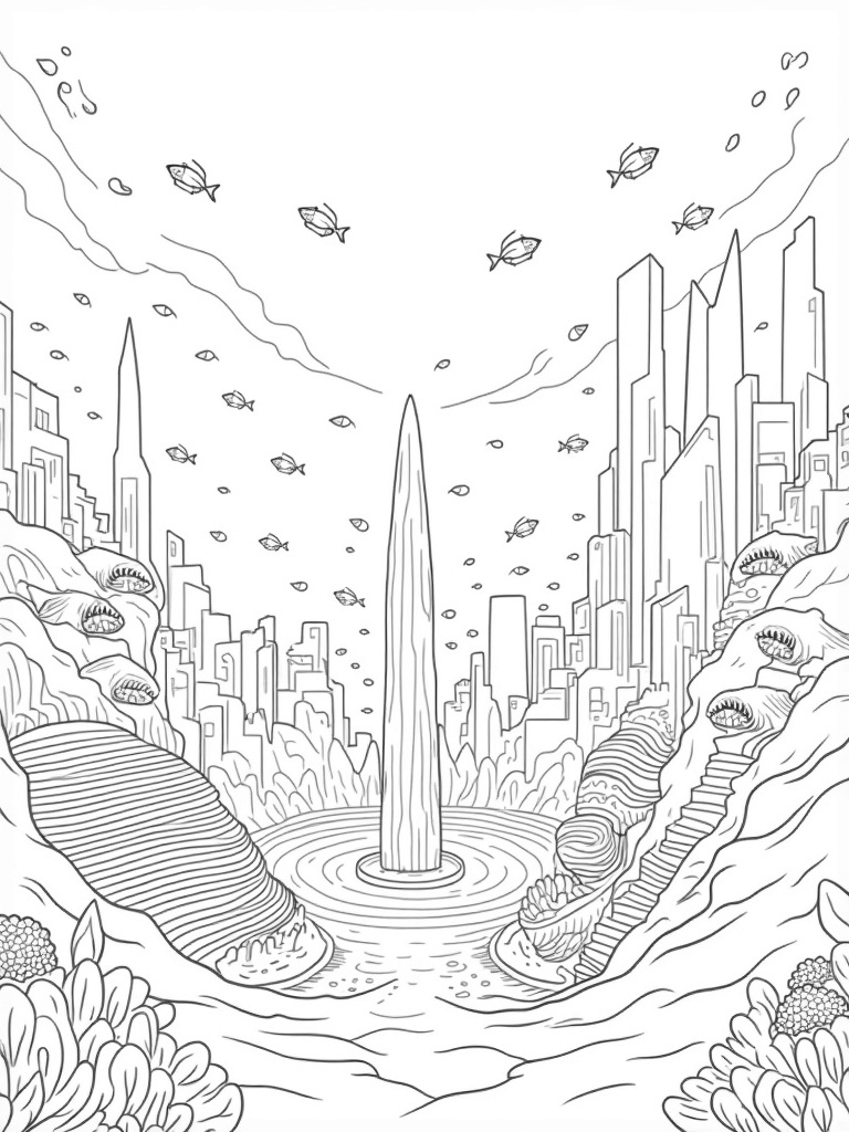 This coloring page showcases an incredible underwater city made entirely of colorful coral structures! You’ll see towering shark fins that peek above the ocean floor like skyscrapers, and schools of fish zipping around the reefs, their scales shining bright like little jewels. It’s a bustling, lively scene that’s just waiting for your creative flair!