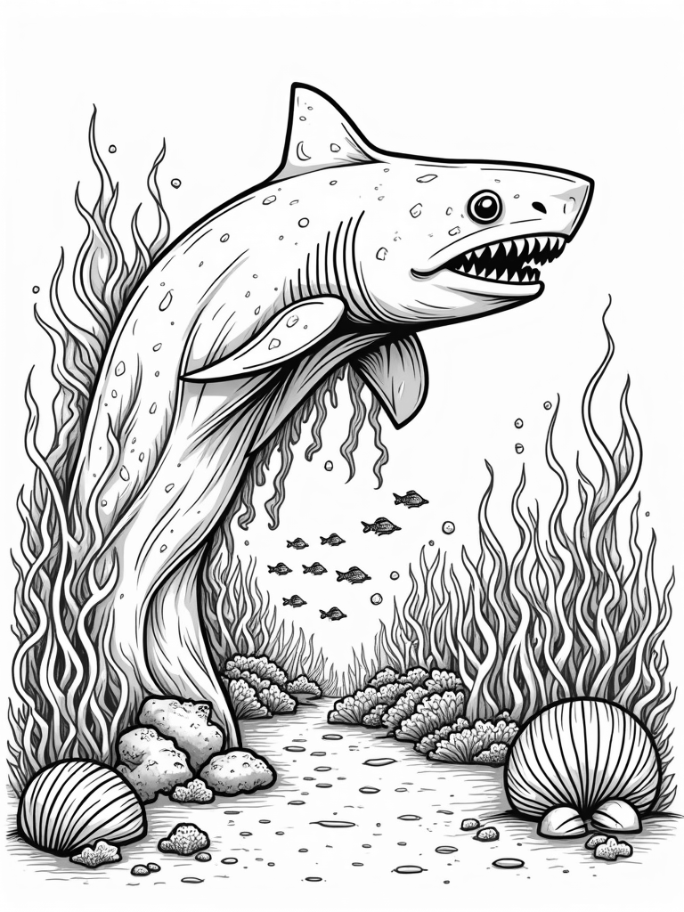 Check out this free, printable coloring page featuring a shark-shaped rock formation and a vibrant coral garden. Dive into coloring schools of fish and seaweed while enjoying this underwater theme. Perfect for kids who love ocean life!