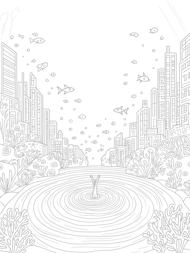 Coral Reef City with Shark Fin Skyscrapers Coloring Page
