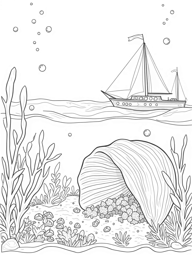 Above the reef, a sunken ship rests quietly on the ocean floor, its portholes glowing with bioluminescent algae—how cool is that? It adds a bit of magic to the scene! As you color, imagine the bubbles rising gently to the surface, creating a peaceful rhythm in this tranquil blue underwater world.