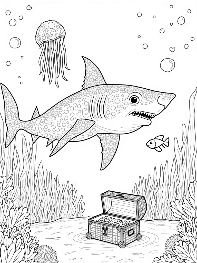 Coral Shark and Treasure in a Colorful Underwater World Coloring Page