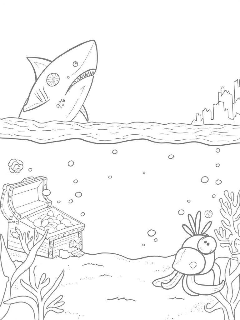 This coloring page brings you a lively underwater world where a giant shark made of colorful coral and seashells swims gracefully through a school of geometric fish. Above, a treasure chest has burst open, spilling shiny jewels and coins across the sandy seabed. It’s like a pirate’s dream, right?