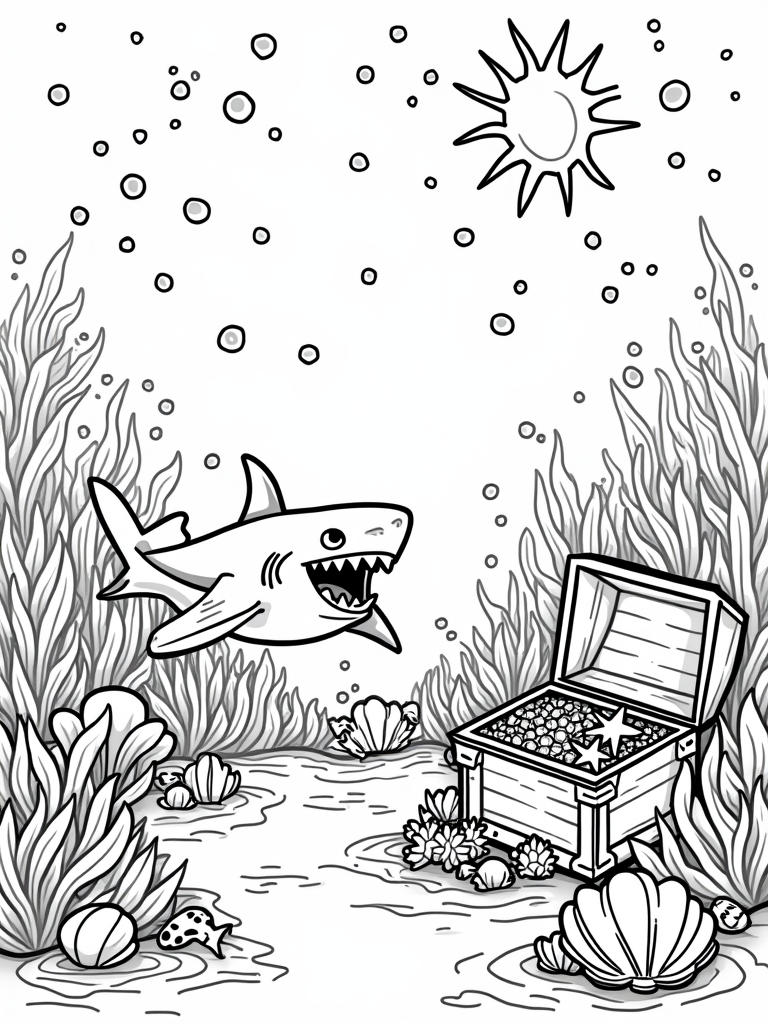 Imagine a vibrant underwater world filled with colorful coral reefs that twist and turn like a maze! In the heart of this scene, there's a friendly shark with big, cartoonish teeth gliding past a school of tiny fish. Each fish has its own unique pattern, making the whole scene even more lively. Nearby, a giant clam opens wide, showing off a treasure chest brimming with shiny shells and starfish. And don't forget the playful bubbles floating up to the surface!